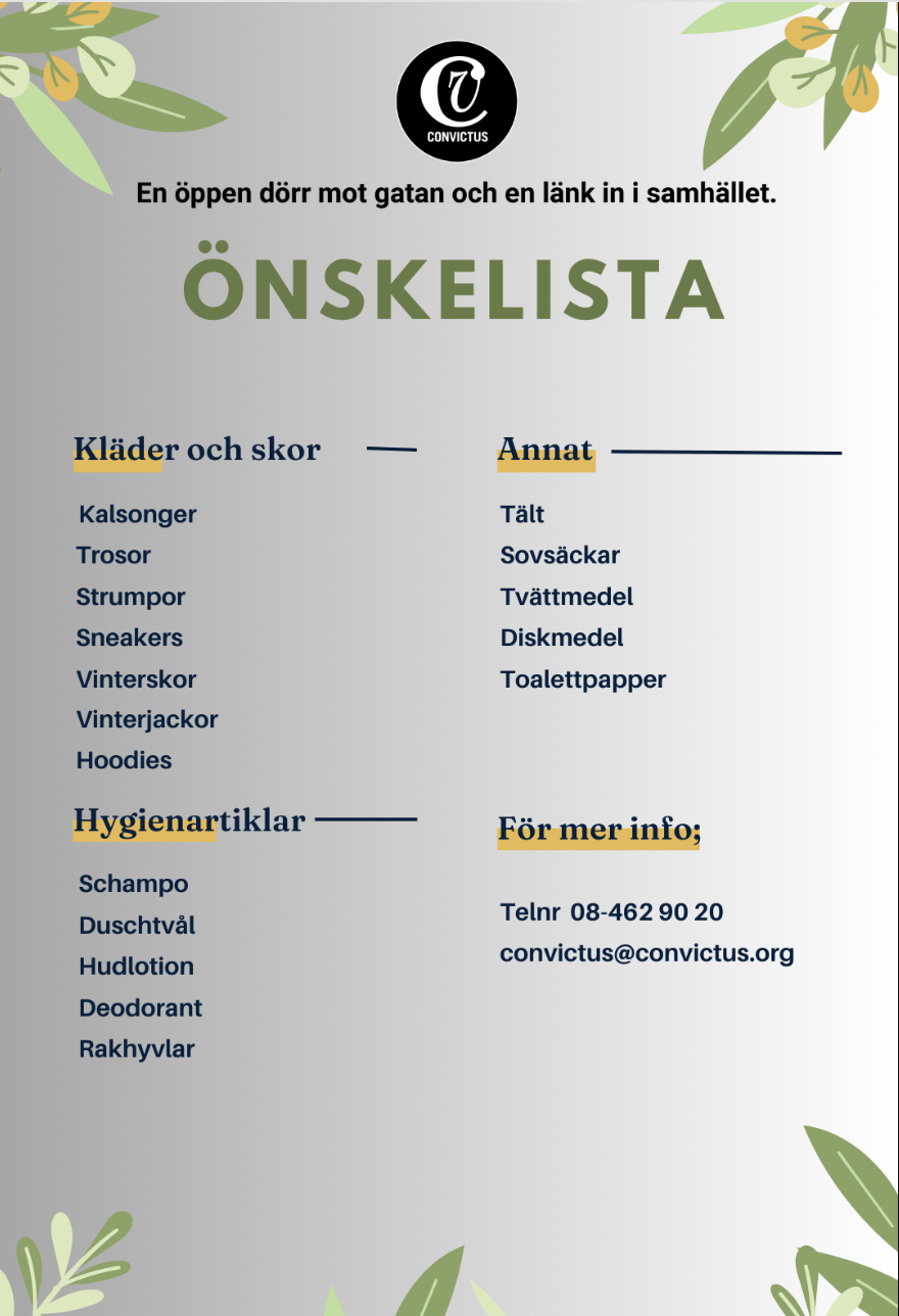 För att kunna erbjuda detta har Convictus behov av gåvor, här bredvid hittar du vår stående önskelista. Varje bidrag räknas - ingen gåva är för liten!